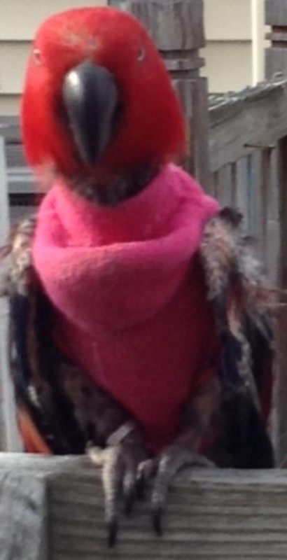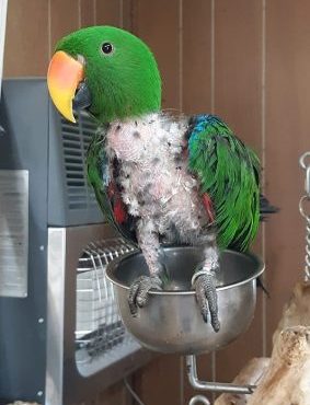 Sam is a Green Eclectus who came to Nana & Papas Nest in 2012. While much of his early history is unknown, we do know that before arriving he was fed a diet of people food and junk food. Combined with stress, this led Sam to over-preen and pull out his feathers to the point that they will not grow