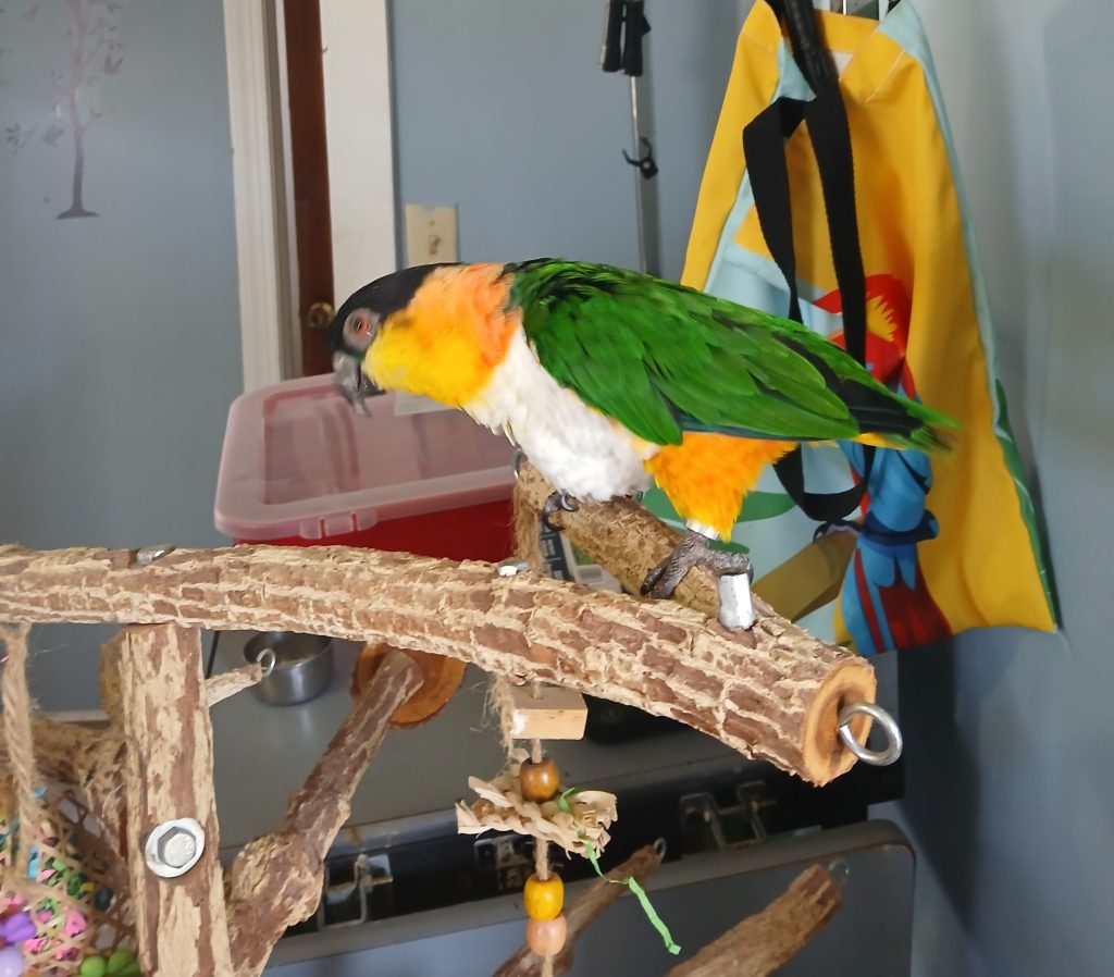 Georgie is a Black-headed Caique who came to Nana & Papas Nest in 2021. He spent the first 6½ years of his life in one loving home before his family made the difficult decision to rehome