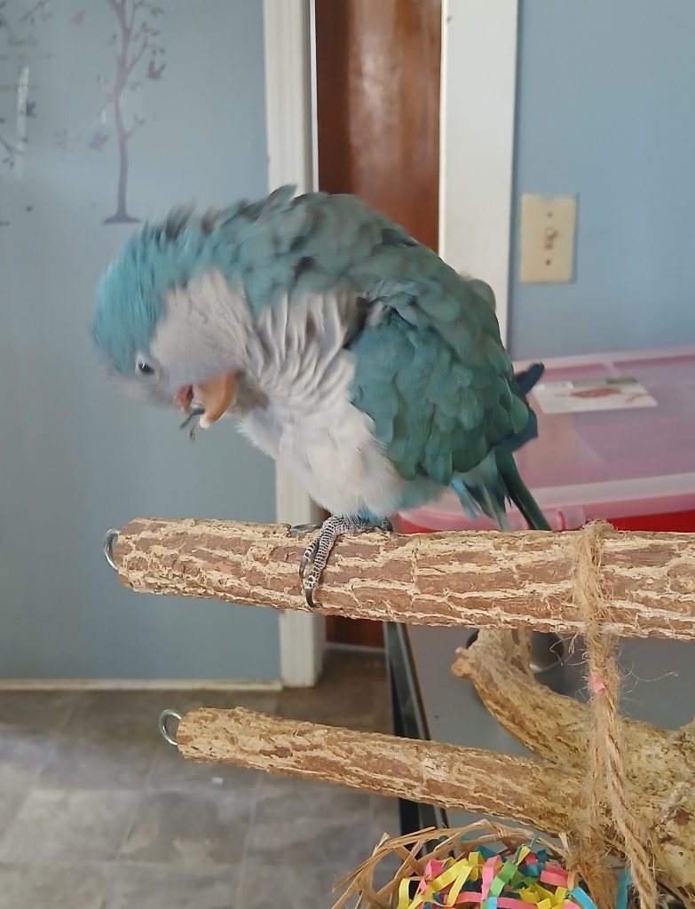 Scoop is a resilient Quaker parrot who came to Nana & Papas Nest in 2021. In his previous home, multiple birds were housed together, and during an unfortunate accident, another bird