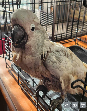 Murdock is a Goffin Cockatoo who joined Nana & Papa’s Nest in 2024. His exact age is unknown, and his story is one of many homes—our rescue is his fifth. His previous home was involved in a fire caused by the owner’s actions, and when Murdock arrived, he was suffering from a chest wound and had begun to self-mutilate due to over-preening.
